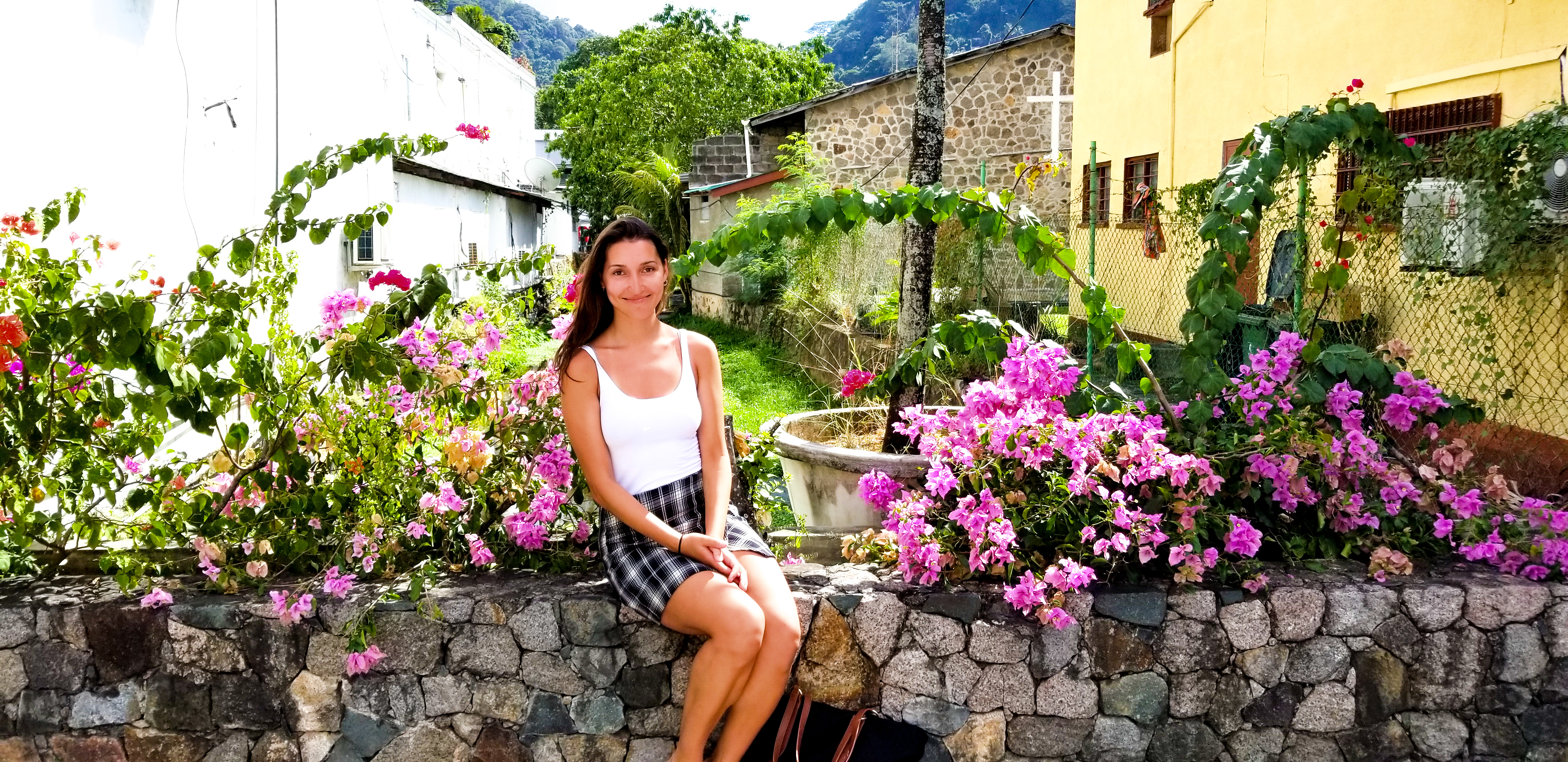 Surrounding the sidewalks are brightly colored buildings fashioned in French colonial architecture. The city is full of life, as the bustling sidewalks are peppered with blooming flowers.