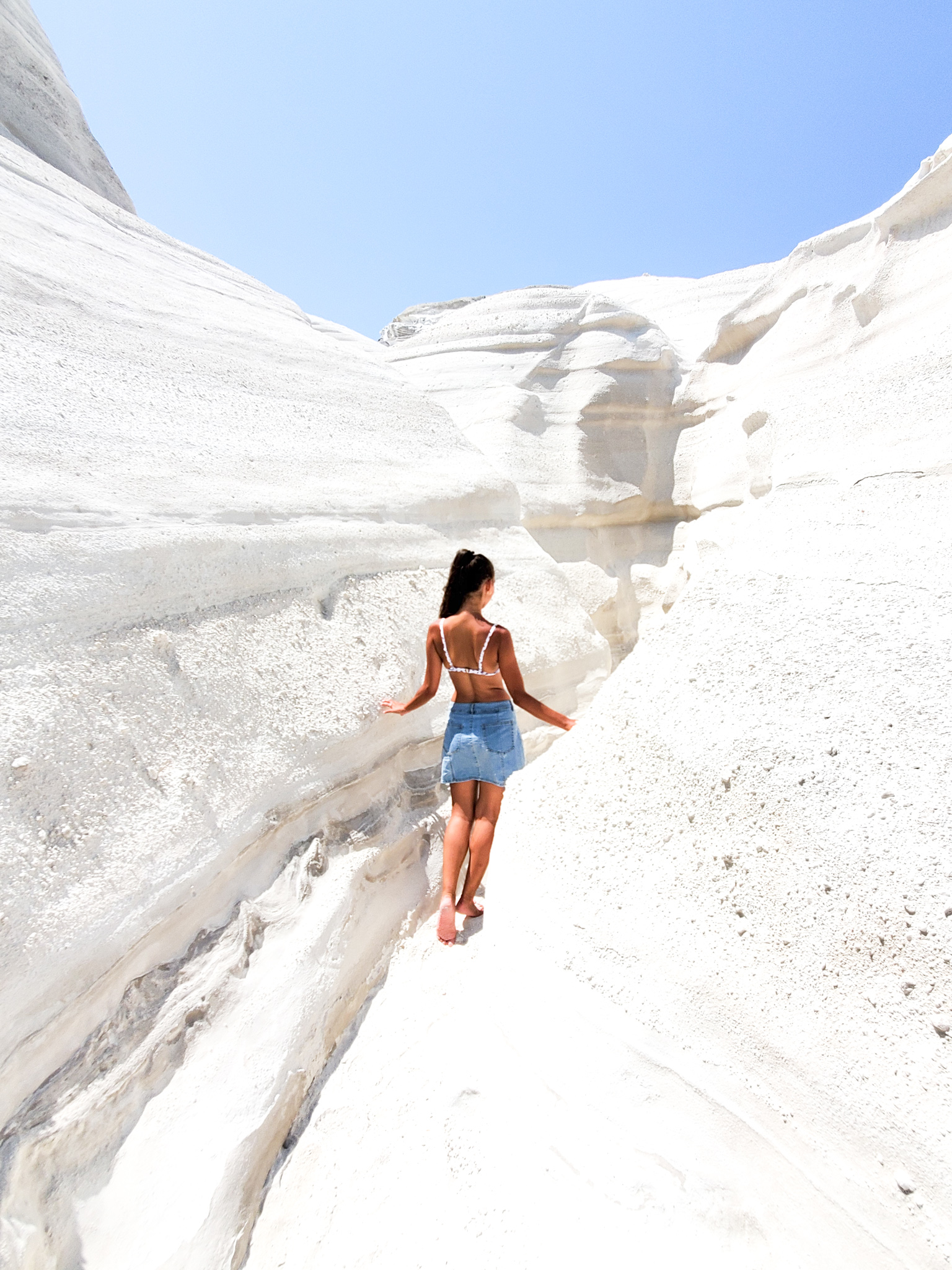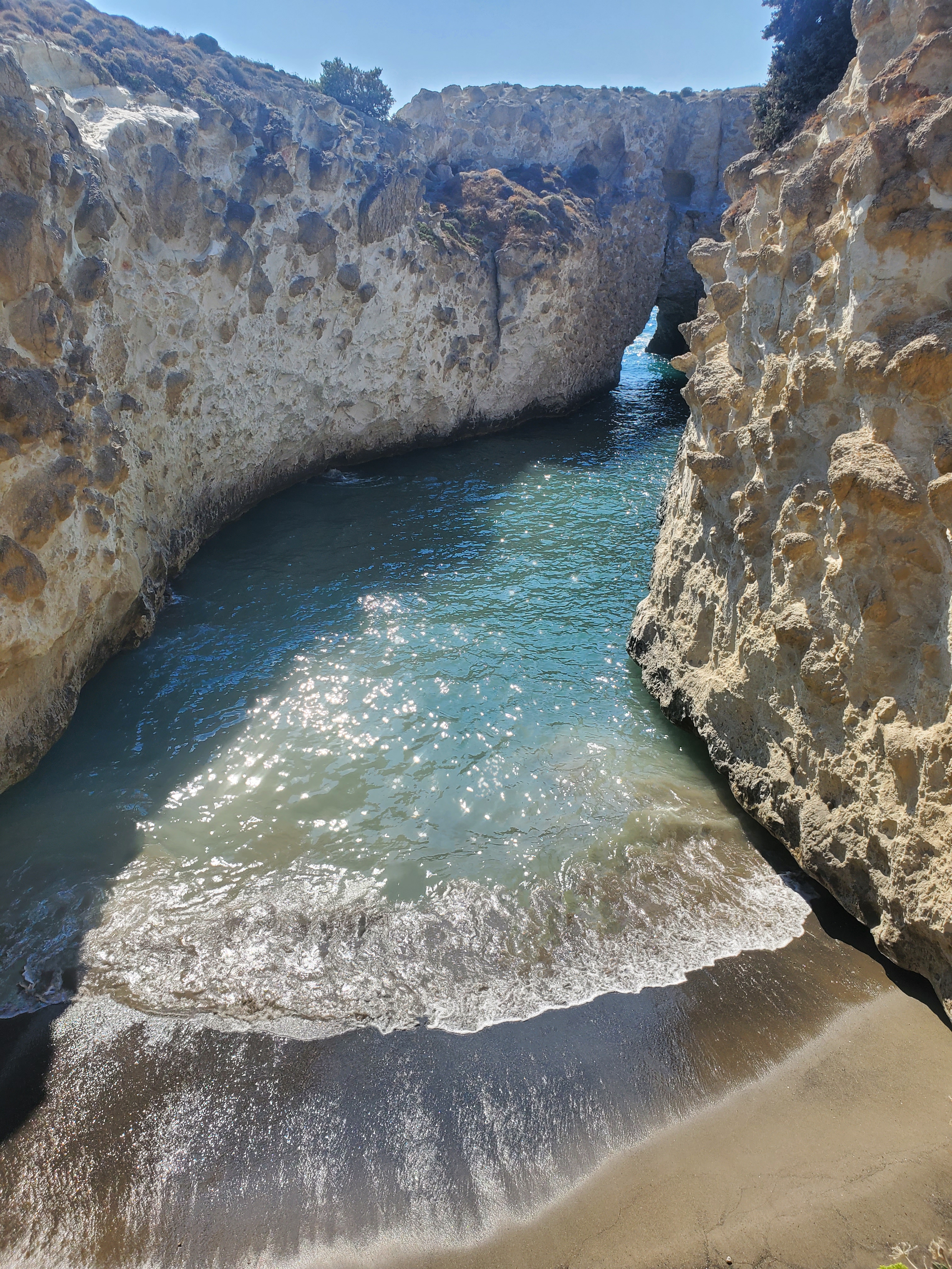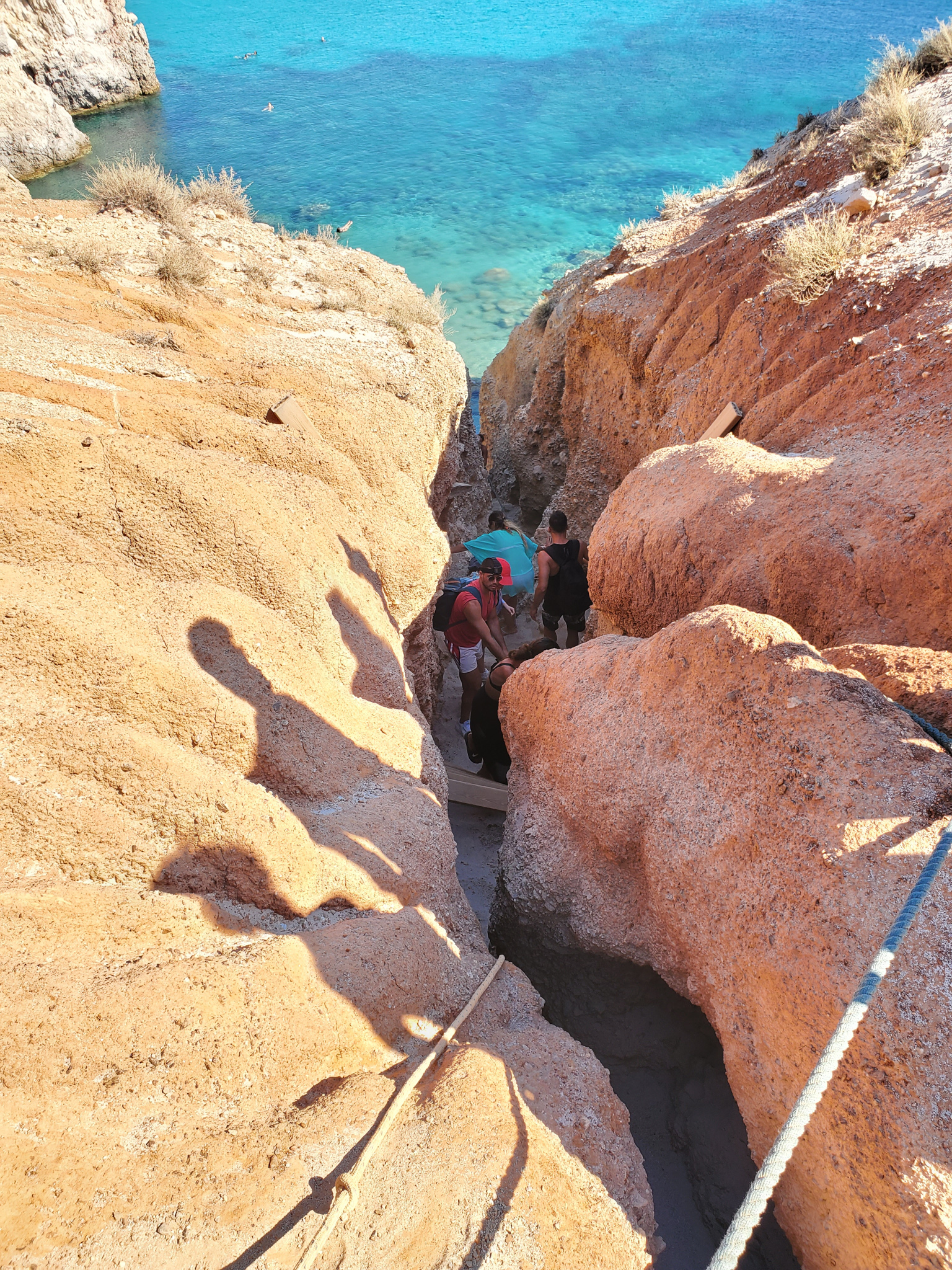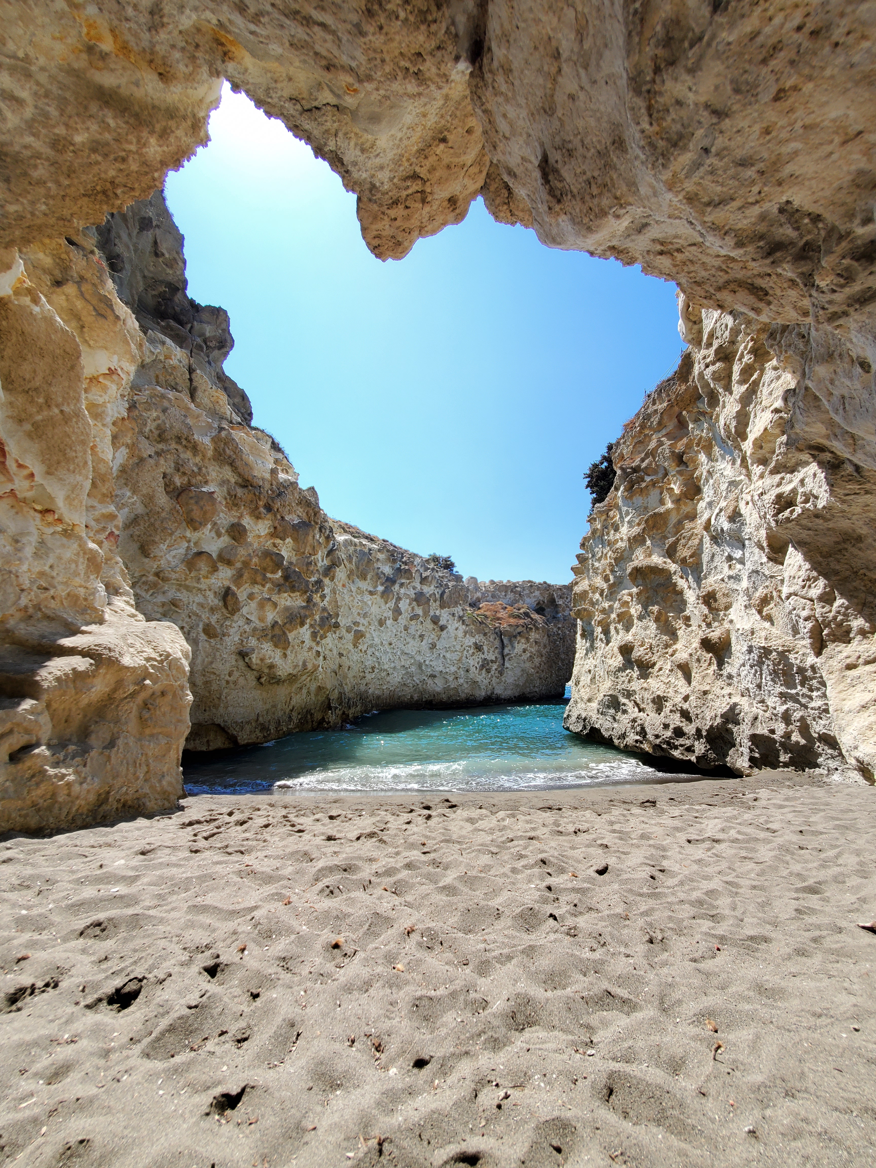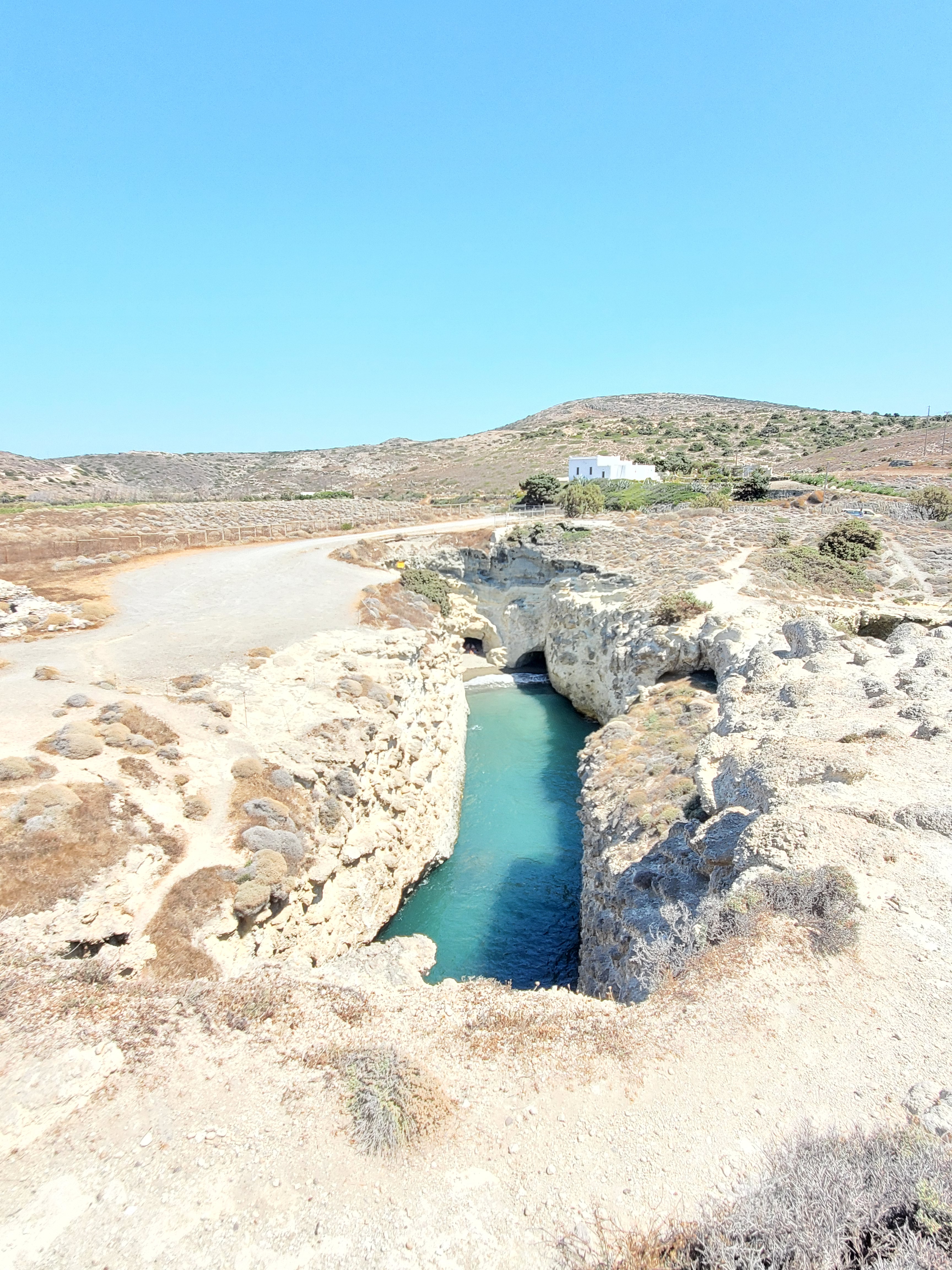 To access the small and unique Papafragas beach, you must walk around the perimeter of the clifftop prior to climbing down and into the cave. To see the beach from above is a surreal experience.